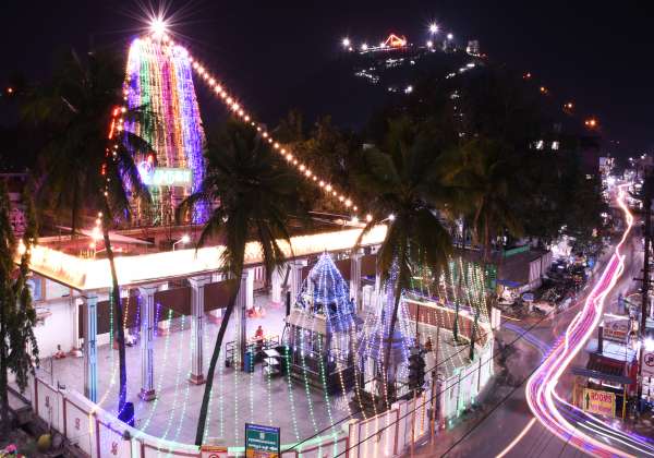தைப்பூச திருவிழாவை முன்னிட்டு பக்தர்களை வரவேற்கும் விதமாக மின்னொளியில் ஜொலிக்கும் பழநி திருஆவினன்குடி கோயில், மலைக்கோயில்.