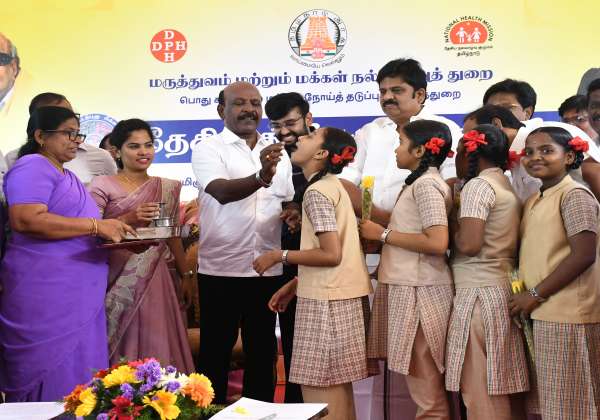 தேசிய குடற்புழு நீக்க நாளை முன்னிட்டு மாணவ மாணவிகளுக்கு குடற்புழு நீக்க மாத்திரையை வழங்கிய மக்கள் நல்வாழ்வுத்துறை அமைச்சர் மா.சுப்பிரமணியன். இடம் : வேளச்சேரி.