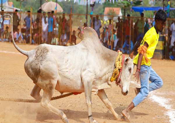 சிவகங்கை அருகே சலுகைபுறத்தில் நடந்த வடமாடு மஞ்சுவிரட்டில் மாடுபிடி வீரை வீரட்டி குத்திய காளை.