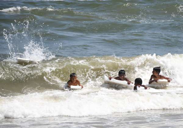 சென்னையில் நாளுக்கு நாள் வெயிலின் தாக்கம் அதிகரித்து வரும் நிலையில் வெயிலை சமாளிக்க மெரினா கடற்கரையில் ஆபத்தை உணராமல் குளிக்கும் சிறுவர்கள்.