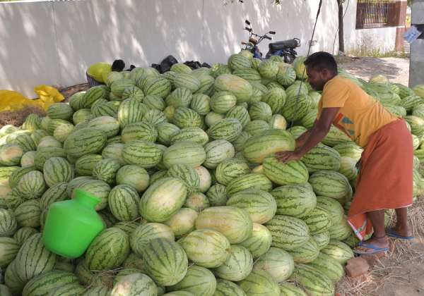 கோடை வெயில் ஆரம்பமான நிலையில் விற்பனைக்கு வந்துள்ள தர்பூசணி பழங்கள்.இடம்:விருதுநகர்.