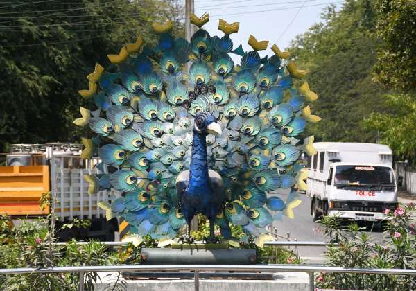 சென்னை எழும்பூர் ஆதித்தனார் சாலை சந்திப்பில் வைக்கப்பட்டுள்ள வண்ண மயில் சிலை காண்போரை கவரும் வண்ணம் உள்ளது.