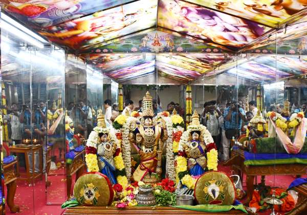 திண்டுக்கல் மாவட்டம் தாடிக்கொம்பு சவுந்தரராஜ பெருமாள் கோயிலில் திறக்கப்பட்ட கண்ணாடி மாளிகையில் எழுந்தருளிய சுவாமி.