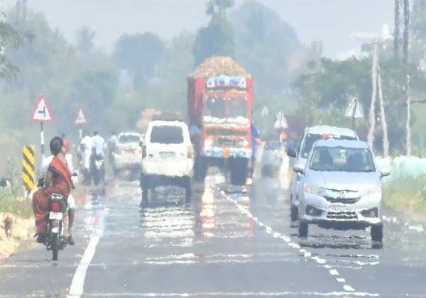வெயிலில் தாக்கம் அதிகரிப்பு: சாலையில் அனல் பறக்கும் கானல் நீர். இடம்: தஞ்சாவூர்- மானாமதுரை பைபாஸ் ரோடு சிவகங்கை.