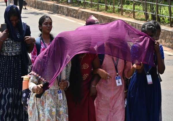 சென்னையில் வெயிலின் தாக்கம் அதிகரித்து வரும் நிலையில் வெப்பத்தில் இருந்து தப்பிக்க துப்பட்டாவால் தலையை மூடிக் கொண்டு செல்லும் கல்லூரி மாணவிகள். இடம் : மெரினா