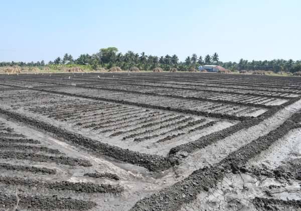 கரும்பு பயிர் நடவு செய்வதற்காக நிலத்தை உழுது பாத்தி அமைத்துள்ளனர்.இடம். உடுமலை