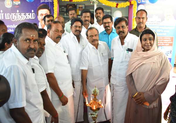 விருத்தாசலம் அடுத்த மங்கலம்பேட்டையில் முதல்வர் மருந்தகத்தை முதல்வர் ஸ்டாலின் காணொளியில் திறந்து வைக்க அமைச்சர் கணேசன் குத்து விளக்கு ஏற்றினார் .அருகில் எம்.எல்.ஏ., ராதாகிருஷ்ணன்.