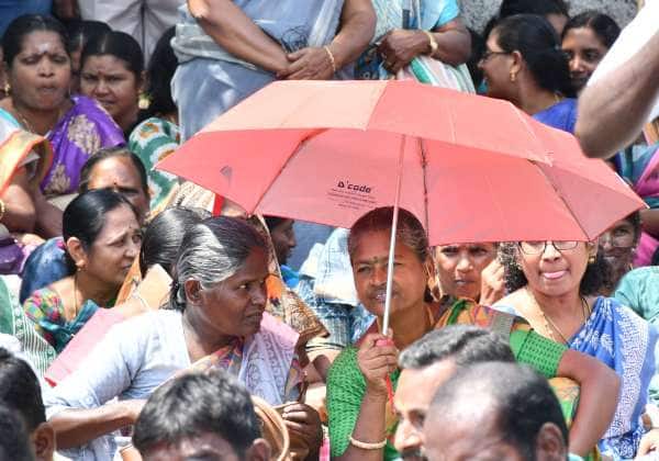 திருப்பூர், கலெக்டர் அலுவலகம் முன் ஜாக்டோ ஜியோ அமைப்பினர் ஆர்ப்பாட்டத்திற்கு குடையுடன் வந்திருந்தனர்.