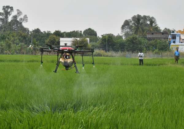 திருநெல்வேலி மாவட்டம் நாங்குநேரி பகுதியில் பயிரிடப்பட்டுள்ள நெற்பயிர்களுக்கு ட்ரோன் மூலம் மருந்து தெளிக்கும் பணியில் ஈடுபட்டுள்ள விவசாயி.