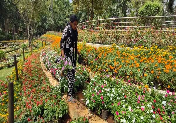 புதுச்சேரி தாவரவியல் பூங்காவில் மலர் கண்காட்சி முடிந்து 17 நாட்களுக்கு பிறகு மலர் செடிகள் விற்பனையில் ஆர்வமாக செடிகளை வாங்கிய பெண்.