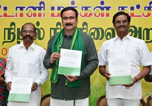 சென்னை தி.நகரில் பா.ம.க., சார்பில் வேளாண் நிழல் நிதிநிலை பட்ஜெட் அறிக்கையை பா.ம.க., தலைவர் அன்புமணி வெளியிட்டார், உடன் கட்சியினர்.
