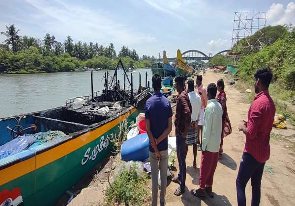 கடலூர் முதுநகர் சிங்காரத்தோப்பு மேம்பாலம் அருகே மர்மமான முறையில் தீப்பற்றி எரிந்து சேதமடைந்த மீன்பிடி விசைப்படகு.
