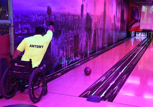 கோவை சரவணம்பட்டி ப்ரோசோன் மாலில் தமிழ்நாடு பாரா டென்பின் பவுலிங் சங்கம் சார்பில் நடைபெற்ற பாரா டென்பின் பவுலிங் போட்டியில் தன் திறமையை வெளிப்படுத்திய வீரர்.
