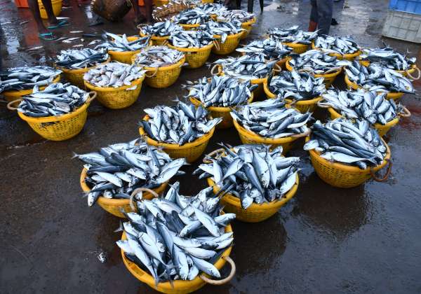 சென்னை, காசிமேடு மீன்பிடி துறைமுகத்தில் விசைப்படகுகளில் பிடித்து வரப்பட்ட மீன்கள் தரம் பிரிக்கப்பட்டு விற்பனைக்காக வைக்கப்பட்டுள்ளன.