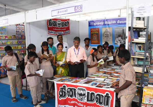 விழுப்புரம் புதிய பஸ் நிலையம் அருகே நகராட்சி திடலில் புத்தகக் கண்காட்சி திருவிழாவில் தினமலர் பிரதர்ஸ் மீடியா புத்தகத் திருவிழாவிற்கு மாணவ மாணவிகள் வந்த கூட்டம்