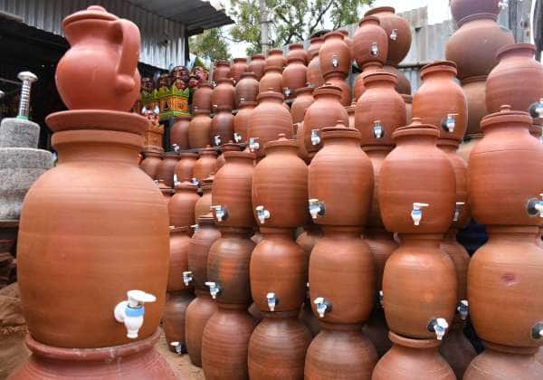 கோடை வெயில் அதிகரித்து கொண்டே போவதை தணிக்க கோவை கவுண்டம்பாளையம் பகுதியில் விற்பனைக்கு வைக்கப்பட்டுள்ள பானைகள்.