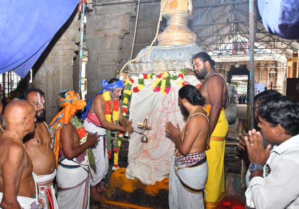 சிவகங்கை மாவட்டம் திருக்கோஷ்டியூர் சவுமிய நாராயண பெருமாள் கோயில் மாசி மகம் தெப்பத்திருவிழா முன்னிட்டு கொடிமரத்திற்கு தீபாராதனை நடைபெற்றது.