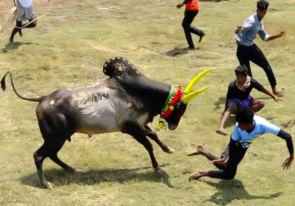 சிவகங்கை அருகே நாமனூரில் நடந்த மஞ்சுவிரட்டில் சீறிப்பாயும் காளை.