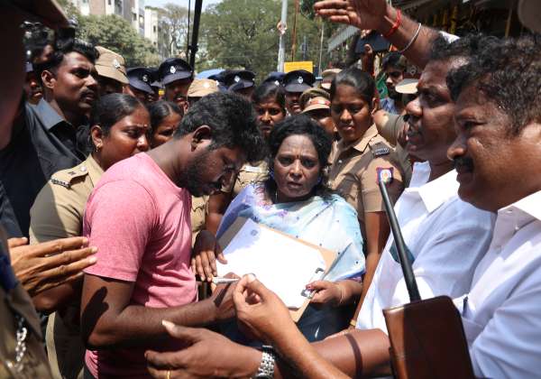 பா.ஜ., மூத்த தலைவர் தமிழிசையை போலீசார் சுற்றி வளைத்து தடுத்து நிறுத்திய நிலையில் அந்த இடத்திற்கு வந்து மும்மொழி கொள்கைக்கு ஆதரவாக கையழுத்திட்ட பொது மக்கள்.