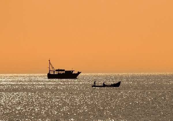 சூரிய உதயத்தில் சூரிய கதிர்கள் கடல் நீரில் பட்டு பிரதிபலிக்கும் ரம்மியமான நேரத்தில் படகுகளில் மீன் பிடிக்கச் செல்லும் மீனவர்கள். இடம் : எலியட்ஸ் கடற்கரை, பெசன்ட் நகர்.