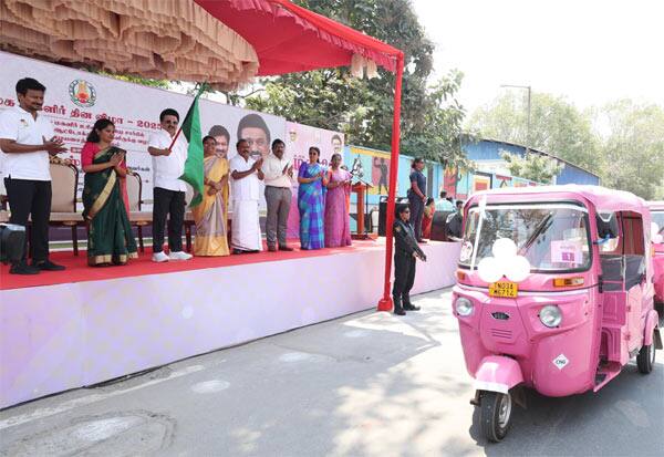 தமிழக அரசு சார்பில் நடந்த மகளிர் தின நிழ்ச்சியில் பிங்க் நிற ஆட்டோக்களை துவக்கி வைத்த முதல்வர் ஸ்டாலின். இடம் : சென்னை