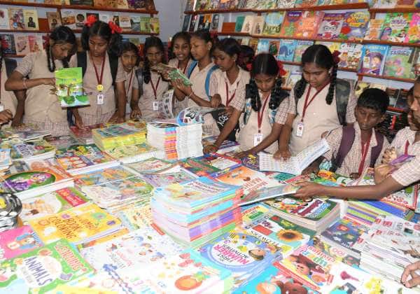 திருவள்ளூர் சிவி நாயுடு சாலையில் தமிழக அரசு சார்பில் நான்காவது புத்தக கண்காட்சியில் பள்ளி மாணவிகள் புத்தகங்களை ஆர்வத்துடன் பார்க்கின்றனர்