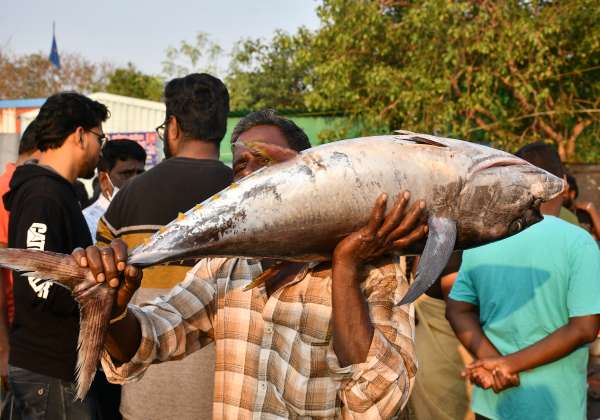 சென்னை காசிமேடு மீன்பிடி துறைமுகத்தில் விசைப்படகுகளில் பிடித்து வரப்பட்ட கேரை மீன் .