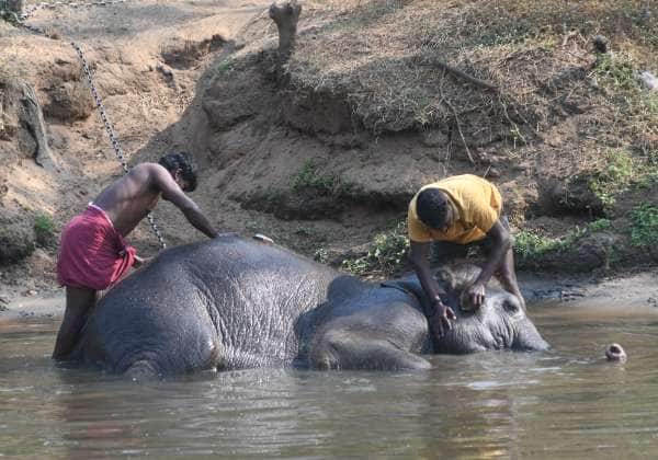 முதுமலை புலிகாப்பக யானைகள் முகாமில், பொம்மி யானையை தொப்பக்காடு பகுதி மாயாற்றில் குளிக்க வைக்கும் பாகன்கள்.
