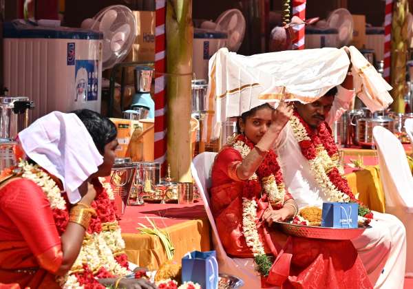 தி.மு.க., சென்னை கிழக்கு மாவட்டம் சார்பில் 72 ஜோடிகளுக்கு திருமணம் நடந்தது. சீர்வரிசை வாங்குவதற்கு வெயிலை சமாளிக்க முடியாமல் தலையில் துண்டை மூடிக்கொண்டு அமர்ந்திருந்த மணமக்கள். இடம்.கலைவாணர் அரங்கம்.