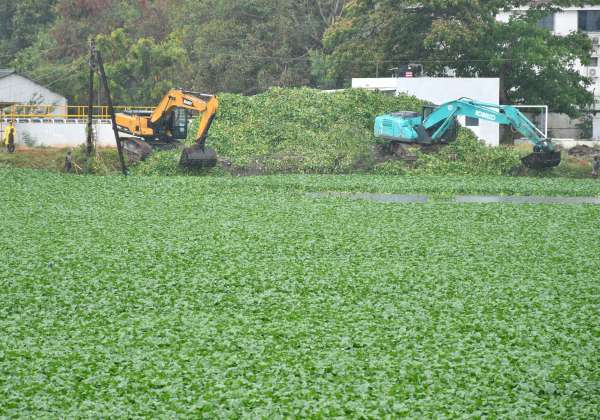 கோவை வாலங்குளத்தில் ஆகாயத்தாமரைகள் அகற்றும் பணி நடந்து வருகிறது.