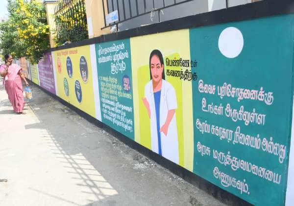 திருவள்ளூர் அரசு மருத்துவக் கல்லூரி மருத்துவமனையில் சுற்று சுவரில் வரையப்பட்டுள்ள ஓவியங்கள்.