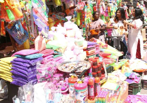 ஹோலி பண்டிகைக்கு சவுகார்பேட்டை தங்கச்சாலை பகுதியில் வண்ணப் பொடிகள் மற்றும் சிறுவர்கள் விளையாடும் ஹோலி தண்ணீரை பீச்சியடிக்கும் பொம்மைகள் உள்ளிட்ட பொருட்களை ஆர்வத்துடன் வாங்கிச் செல்லும் மக்கள்.