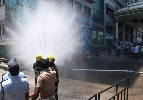 பொது இடங்களில் தீப்பிடித்தால் எப்படி மீட்பு நடவடிக்கை மேற்கொள்ள வேண்டும் என தீயணைப்பு துறை சார்பில் சென்னை ராஜீவ் காந்தி அரசு பொது மருத்துவமனை வளாகத்தில் ஒத்திகை நிகழ்ச்சி மேற்கொண்டனர் .