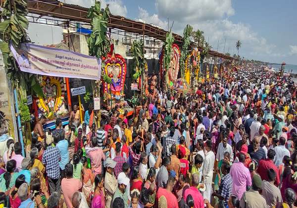 புதுச்சேரி வைத்திக்குப்பம் கடற்கரையில் நடந்த மாசி மக திருவிழாவில் தீர்த்தவாரிக்கு வந்த சுவாமிகளை காண அலைமோதிய மக்கள் கூட்டம்.
