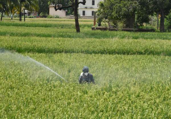 திருநெல்வேலி மாவட்டம் மேலச்செவல் பகுதியில் பயிரிடப்பட்டுள்ள நெற்பயிர்களுக்கு மருந்து தெளிக்கும் பணியில் ஈடுபட்டுள்ள விவசாயி.