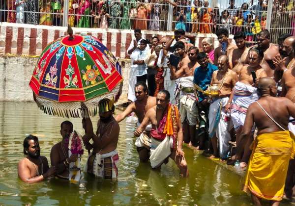 திருக்கோஷ்டியூர் சவுமிய நாராயண பெருமாள் கோயில் மாசி தெப்பத்திருவிழா நிறைவு நாளன்று குளத்தில் தீர்த்தவாரி நிகழ்ச்சி நடைபெற்றது.