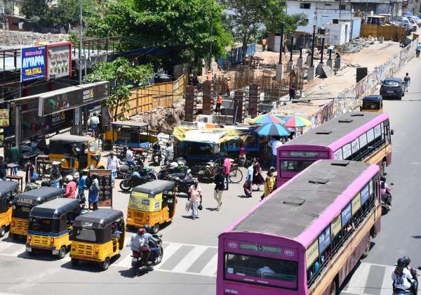 பேருந்து நிலையத்தை ஆக்கிரமித்து நிறுத்தி வைக்கப்பட்டுள்ள வாகனங்கள் மற்றும் கடைகள் . இடம் : அமைந்தகரை, ஸ்கைவாக் எதிரில்