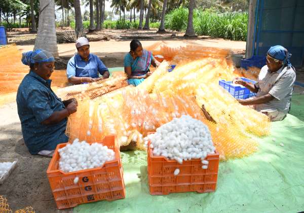 உடுமலை சின்னவீரம்பட்டியில் வலையிலிருந்து வென்பட்டு கூடுகளை எடுக்கும் தொழிலாளர்கள் .