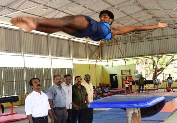 மதுரை ரேஸ்கோர்ஸ் மைதானத்தில் நடந்த காமராஜ் பல்கலை கல்லூரிகளுக்கு இடையேயான ஜிம்னாஸ்டிக் போட்டியில் திறமையை வெளிப்படுத்திய மாணவர்.