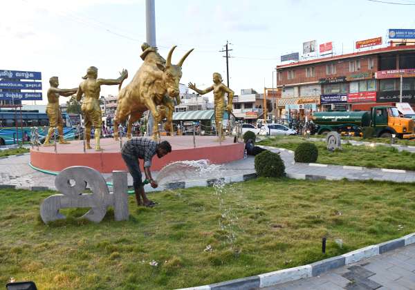 உடுமலை நகராட்சி குடிநீர் லாரி மூலம் பஸ் ஸ்டாண்ட் ரவுண்டானாவில் உள்ள புல்தரைக்கு தண்ணீர் அடிக்கும் ஊழியர்.