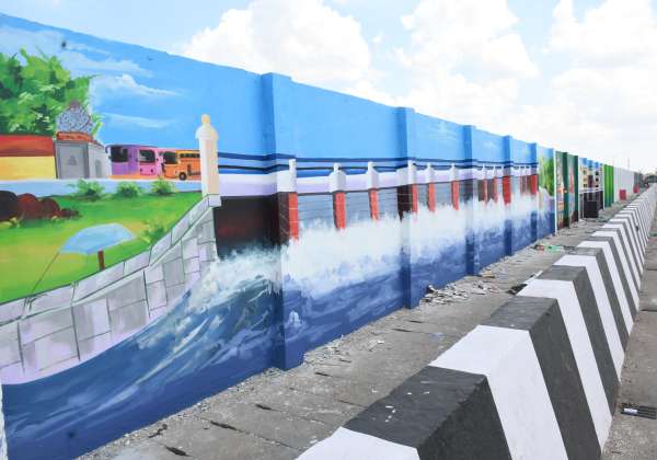 திருவள்ளூர் மணவாள நகர் ரயில்வே மேம்பாலத்தில் சுற்றுச்சுவரில் வண்ண ஓவியமாக பூண்டி நீர்த்தேக்கம் வரையப்பட்டுள்ளது