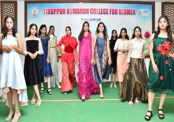 திருப்பூர், குமரன் மகளிர் கல்லூரியில் ஆடைவடிமைப்பு துறை சார்பில்பேஷன் எலெக்ட் 2025 நடந்தது. அதில் மாணவியர் வடிவமைத்த ஆடைகளை அணிந்து வந்திருந்த சக மாணவியர்.