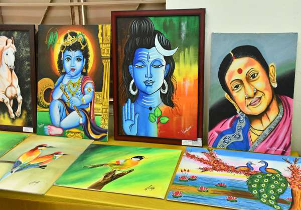 திருப்பூர், எல். ஆர்.ஜி., அரசு மகளிர் கல்லூரியில் கலைப்பண்பாட்டு துறை சார்பில் நடந்த ஓவிய கண்காட்சியில் இடம் பெற்ற ஓவியங்கள்.