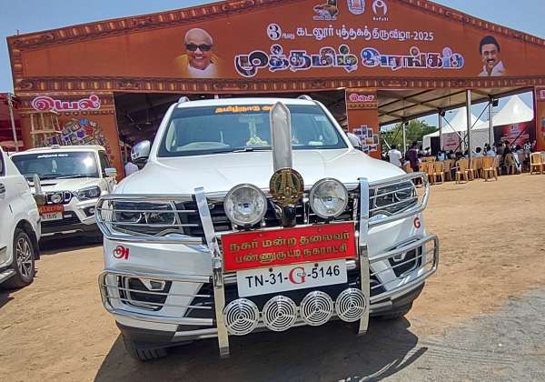 போக்குவரத்து விதிகளுக்கு புறம்பாக பம்பர் பொருத்தப்பட்ட காரில் கடலூர் புத்தக திருவிழாக்கு வந்திருந்த பண்ருட்டி நகராட்சித் தலைவரின் வாகனம். இடம் .கடலூர் மஞ்சக்குப்பம் மைதானம்.