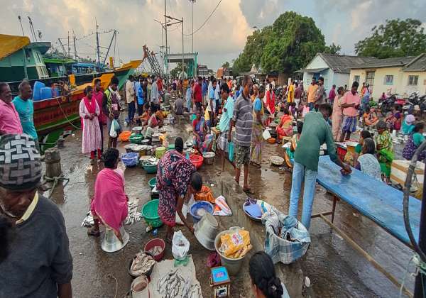 கடலூர் முதுநகர் மீன் பிடி துறைமுகத்தில் மீன் வாங்க வந்த கூட்டத்தின் ஒரு பகுதி