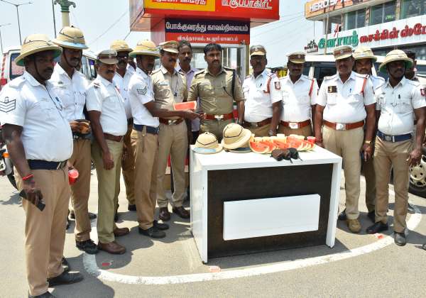விருத்தாசலம் போக்குவரத்து போலீசாருக்கு கோடை வெப்பத்தை சமாளிக்க தொப்பி மற்றும் கண்ணாடி, பழச்சாறு வகைகளை டிஎஸ்பி பாலகிருஷ்ணன் போக்குவரத்து போலீசாருக்கு வழங்கினார்.