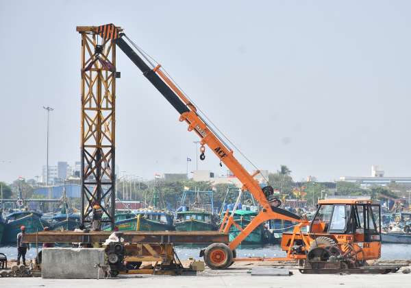 சென்னை காசிமேடு மீன் பிடி துறைமுகத்தில் கப்பல் பழுது பார்க்கும் தளம் அமைக்கும் பணி நடந்து வருகிறது.