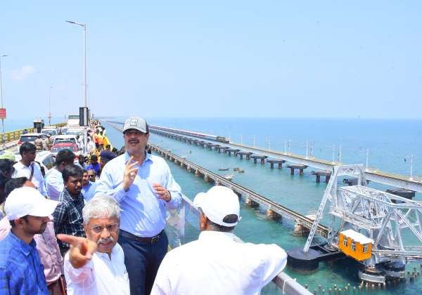 ராமேஸ்வரம் அருகே பாம்பன் புதிய ரயில் பாலம் ஏப்., 6ல் நடக்கவுள்ள திறப்பு விழா குறித்து (உயரத்தில் நிற்பவர்) தென்னக ரயில்வே பொது மேலாளர் ஆர்.என். சிங் ஆய்வு செய்தார்.