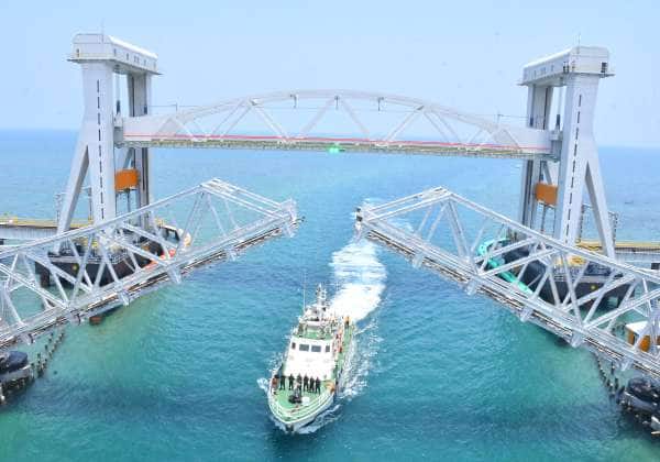 ராமேஸ்வரம் பாம்பன் புதிய பாலம் திறப்பு விழா யொட்டி இந்திய கடலோர காவல்படை ரோந்து கப்பல் பாலத்தை கடந்து சோதனை ஓட்டம் நடந்தது.
