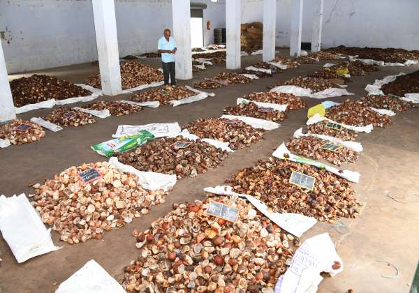 மின்னணு முறையில் ஏலம் விடுவதற்காக உடுமலை ஒழுங்குமுறை விற்பனை கூடத்தில் விவசாயிகள் கொண்டு வந்தார் கொப்பரைகள் வரிசையாக குவித்து வைக்கப்பட்டுள்ளன.